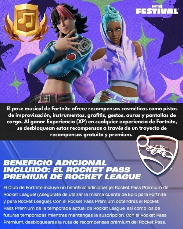 ⭐PASE ROCKET LEAGUE: El Club de Fortnite incluye un beneficio adicional: ¡el Rocket Pass Premium de Rocket League! (Asegúrate de utilizar la misma cuenta de Epic para Fortnite y para Rocket League). Con el Rocket Pass Premium obtendrás el Rocket Pass Premium de la temporada actual de Rocket League, así como los de futuras temporadas mientras mantengas la suscripción. Con el Rocket Pass Premium, desbloquearás la ruta de recompensas prémium del Rocket Pass.